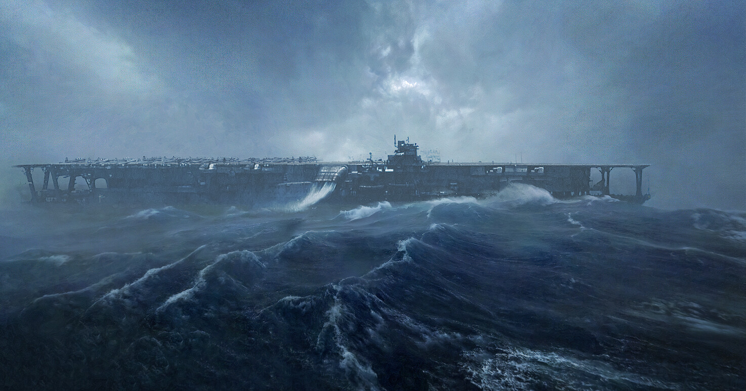 Kaga (加賀) in North Pacific Storm, 1941. Не уверен, что самолеты стояли на палубе в шторм, но красивый арт.